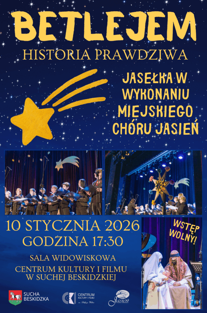 Serdecznie zapraszamy na niezwykłe jasełka „Betlejem. Historia prawdziwa” w wykonaniu Miejskiego Chóru Jasień. To poruszająca opowieść o narodzinach Jezusa, opowiedziana muzyką, słowem i wspólnym przeżywaniem tajemnicy Betlejem. Chóralne brzmienie, świąteczna atmosfera i głębia przekazu sprawią, że będzie to piękne spotkanie dla całych rodzin. Wydarzenie odbędzie się 10 stycznia 2026 r. o godz. 17:30 w sali widowiskowej Centrum Kultury i Filmu w Suchej Beskidzkiej.