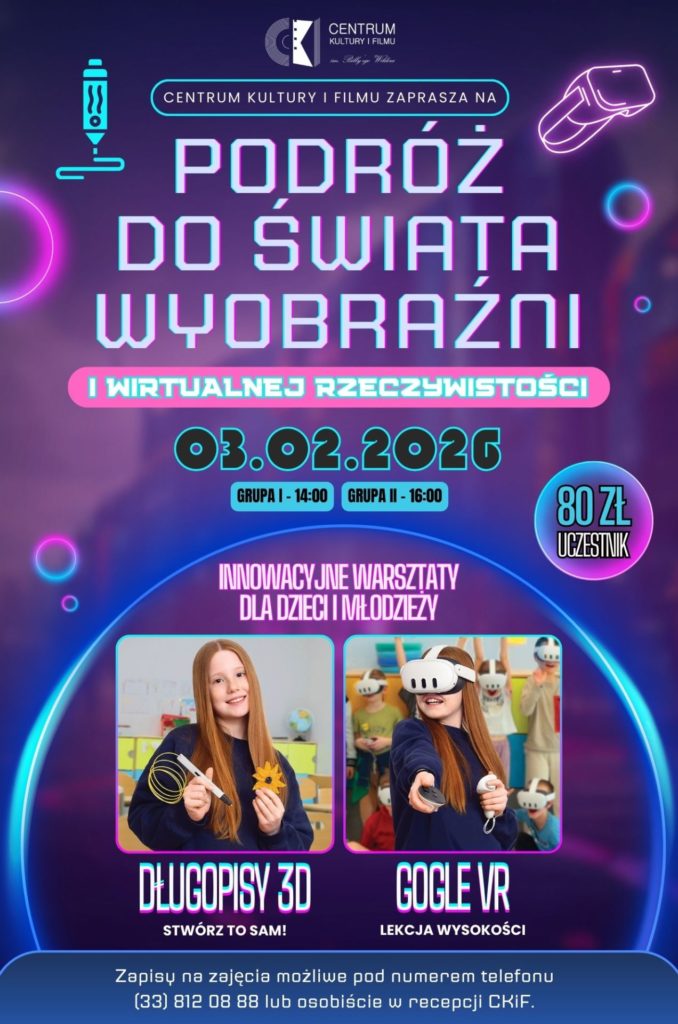 – Innowacyjne warsztaty z wykorzystaniem gogli VR oraz długopisów 3D – warsztaty, podczas których uczestnicy poznają nowe technologie w praktyce. Zajęcia łączą doświadczenia w wirtualnej rzeczywistości z kreatywnym projektowaniem przy użyciu długopisów 3D, rozwijając wyobraźnię, umiejętności techniczne i twórcze myślenie.