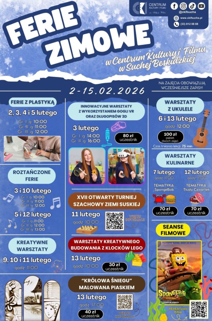 Serdecznie zapraszamy dzieci, młodzież i całe rodziny do spędzenia tegorocznych ferii zimowych w Centrum Kultury i Filmu! Przygotowaliśmy dla Was bogaty program zajęć i atrakcji, które zapewnią niezapomniane wspomnienia i pozwolą spędzić tą dwutygodniową przerwę w aktywny i kreatywny sposób.