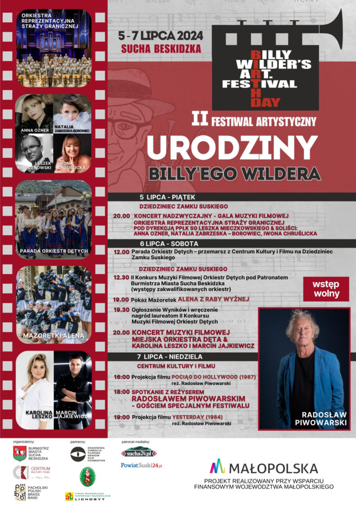 W nawiązaniu do miejsca urodzenia słynnego hollywoodzkiego scenarzysty i reżysera, sześciokrotnego zdobywcy Oscara – Billy’ego Wildera, którego imieniem nazwany został obiekt Centrum Kultury i Filmu w Suchej Beskidzkiej zapraszamy na drugą edycję Festiwalu Artystycznego pod nazwą Urodziny Billy’ego Wildera. To mozaika różnorodnych wydarzeń, która łączy miłośników świata filmu, pasjonatów muzyki filmowej i wielu innych dziedzin. W ramach wydarzenia zaplanowano koncerty muzyki filmowej, cykl pokazów filmowych, a także spotkanie autorskie oraz II Konkurs Muzyki Filmowej Orkiestr Dętych, za sprawą którego do Suchej Beskidzkiej zawita dwanaście muzycznych formacji wyłonionych w drodze kwalifikacji z różnych zakątków województwa małopolskiego i kraju. Gościem specjalnym drugiej edycji Urodzin Billy’ego Wildera jest ceniony polski reżyser filmowy i teatralny – Radosław Piwowarski, który w czasie spotkania opowie o najnowszym filmie, publikacji oraz prezentowanych w czasie festiwalu projekcjach. WSTĘP NA WSZYSTKIE WYDARZENIA JEST WOLNY ZAPRASZAMY!!!