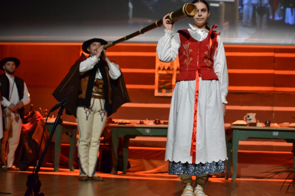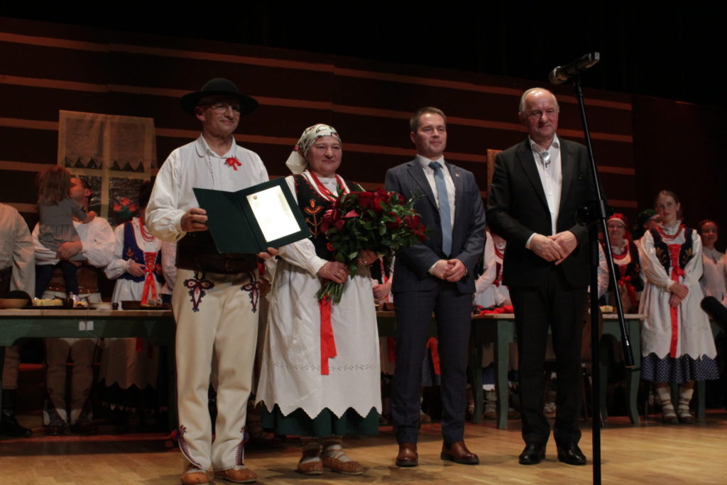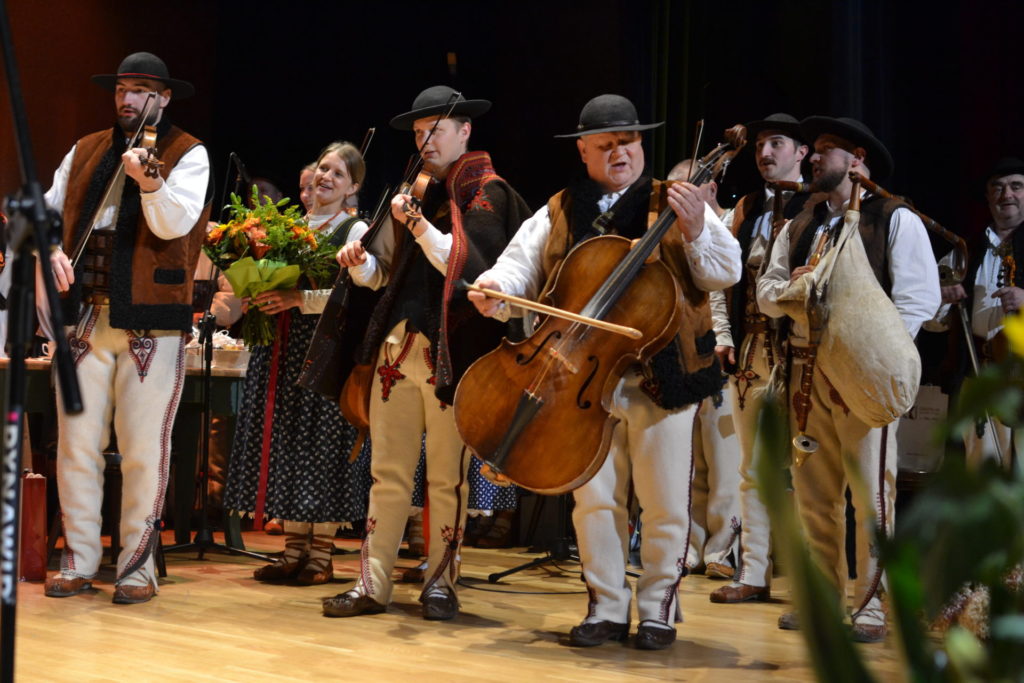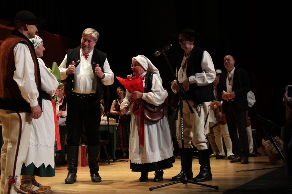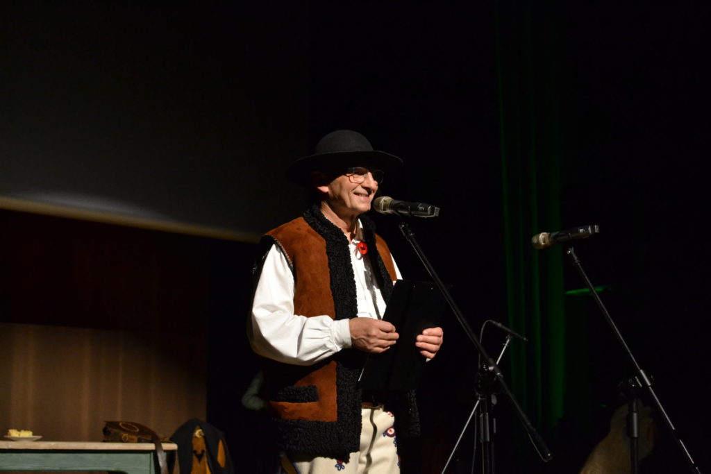 Następnie na scenie zaprezentowano przedstawienie „W karczmie” – barwny, pełen humoru spektakl zawierający scenki rodzajowe oraz tańce regionalne. Jego żywa forma pokazała, jak dynamicznie i nowocześnie można interpretować tradycję, nie tracąc jej autentycznego charakteru. Uroczystość zwieńczyło wspólne odśpiewanie hymnu górali beskidzkich „Szumi jawor szumi” przez członków zespołu, zaproszone grupy regionalne oraz publiczność, co stworzyło niezwykle podniosły i integrujący moment.