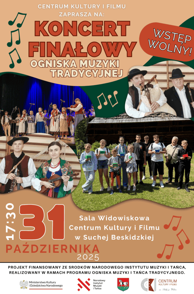 31 października 2025 o godz. 17:30 zapraszamy na koncert finałowy Ogniska Muzyki Tradycyjnej, który odbędzie się w sali widowiskowej Centrum Kultury i Filmu w Suchej Beskidzkiej. Wydarzenie będzie stanowiło podsumowanie działalności ogniska, w ramach którego uczniowie wraz z działającymi przy Centrum Kultury i Filmu kapelami będą przedstawiać babiogórskie przyśpiewki i pieśni, a koncert uświetni swoim tańcem zespół regionalny. Podczas wydarzenia zostaną zaprezentowane tzw. ,,stare nuty”, czyli odkryte, wcześniej zapomniane pieśni z regionu Podbabiogórza, we wspólnym wykonaniu uczniów ogniska ze starszymi członkami regionalnych kapel. Wstęp wolny. Zapraszamy!