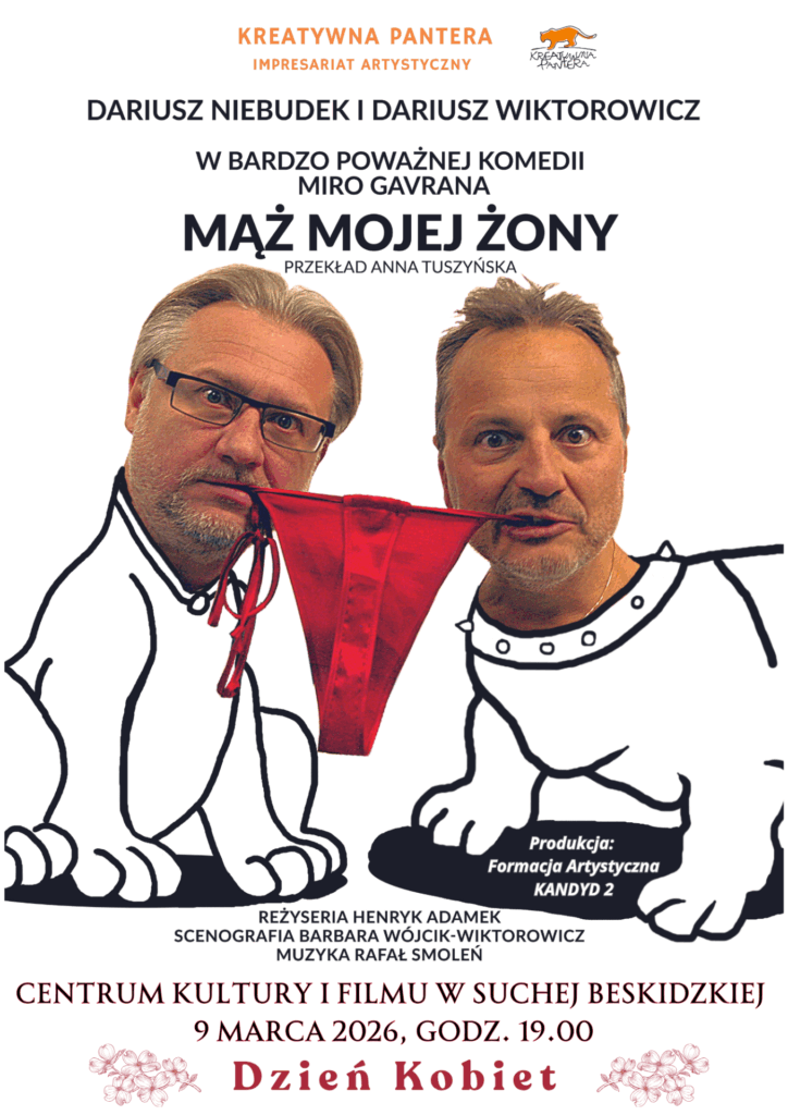 Serdecznie zapraszamy na bardzo poważną komedię pt. „Mąż mojej żony”, która odbędzie się 9 marca 2026 r. o godzinie 19:00 w Centrum Kultury i Filmu w Suchej Beskidzkiej!