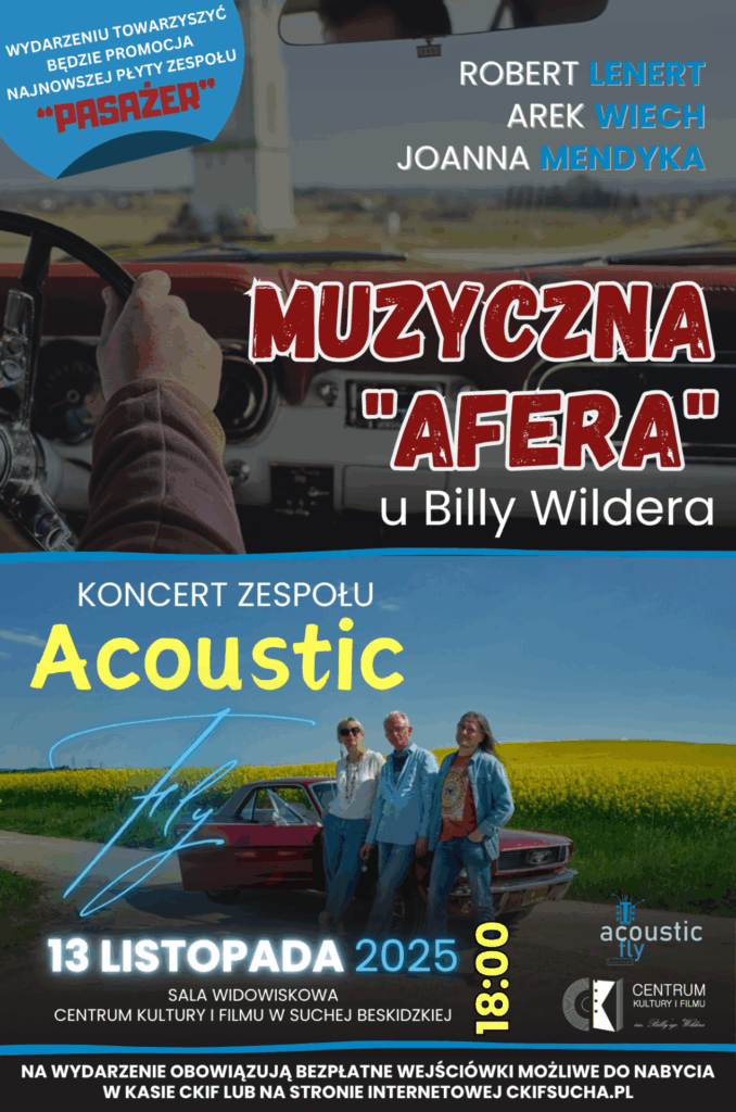 Serdecznie zapraszamy na koncert akustycznego tria bluesowego Acoustic Fly, który odbędzie się 13 listopada 2025 r. o godzinie 18:00 w sali widowiskowej Centrum Kultury i Filmu w Suchej Beskidzkiej.
