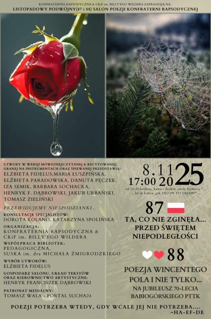 Dziękujemy artystom oraz publiczności za to niezwykłe wydarzenie i już dzisiaj zapraszamy na niepodległościowy Salon Poezji, który odbędzie się 8 listopada o godzinie 17:00 w Centrum Kultury i Filmu w Suchej Beskidzkiej. Szczegóły dostępne na plakacie poniżej.