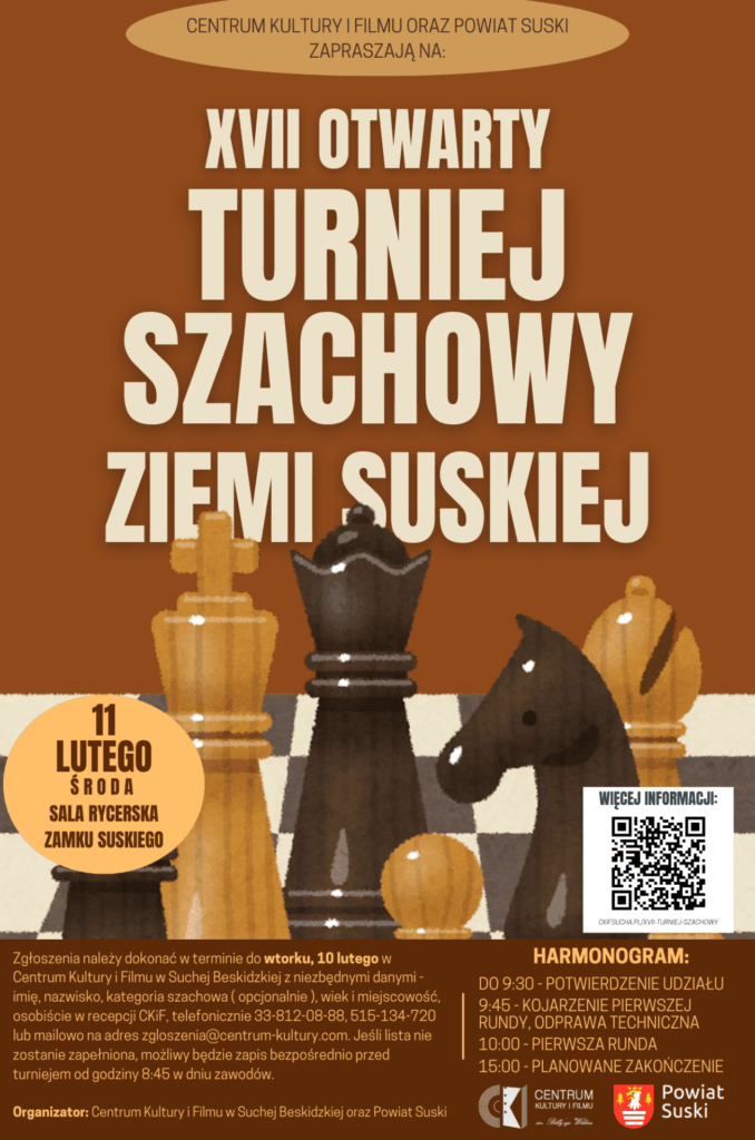 Zgłoszenia: Należy dokonać w terminie do wtorku, 10 lutego w Centrum Kultury i Filmu w Suchej Beskidzkiej z niezbędnymi danymi – imię, nazwisko, kategoria szachowa ( opcjonalnie ), wiek i miejscowość, osobiście w recepcji CKiF, telefonicznie 33-812-08-88, 515-134-720 lub mailowo na adres zgloszenia@centrum-kultury.com. Jeśli lista nie zostanie zapełniona, możliwy będzie zapis bezpośrednio przed turniejem od godziny 8:45 w dniu zawodów.